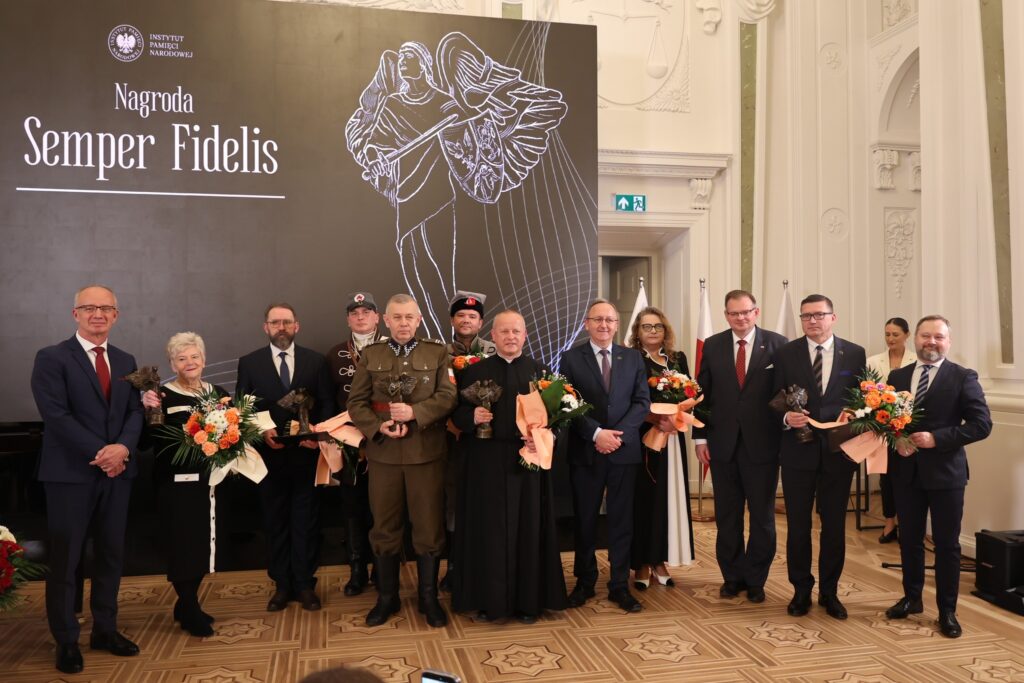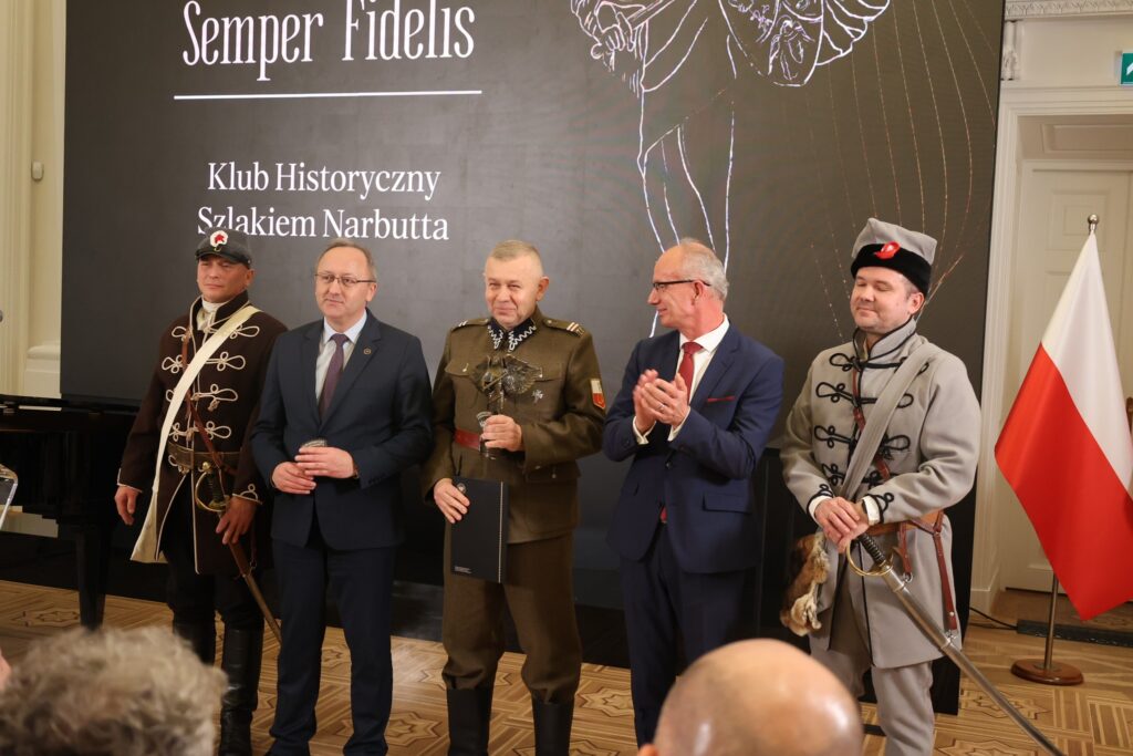 Od 2019 roku Instytut Pamięci Narodowej przyznaje nagrodę “Semper Fidelis” osobom i instytucjom, które w sposób szczególny pielęgnują pamięć o polskości na Kresach Wschodnich. W tegorocznej edycji, wśród pięciorga laureatów, znalazł się Klub Historyczny “Szlakiem Narbutta”, którego działalność na Wileńszczyźnie jest coraz mocniej zauważana. To cały wachlarz działań o charakterze edukacyjnym, ale też upamiętnienia i organizacja wydarzeń historycznych. 5. listopada br., podczas wręczania nagrody prezes KH “Szlakiem Narbutta”, dziękując kapitule za to szczególne wyróżnienie, wspomniał o “dobrym duchu”, który jest każdorazowo obecny podczas wypraw klubu na Wileńszczyznę. Tą szczególną osobą jest siostra Michaela Rak, z wileńskiego hospicjum, która swoją charyzmą otacza również działania klubowiczów. Nagrodę “Semper Fidelis” z rąk zastępców prezesa IPN, dr hab. Karola Polejowskiego oraz dr hab. Krzysztofa Szwagrzyka odebrali: prezes Wojciech Prusaczyk wraz członkami klubu: Maciejem Puzikiem i Julianem Dalidowiczem.